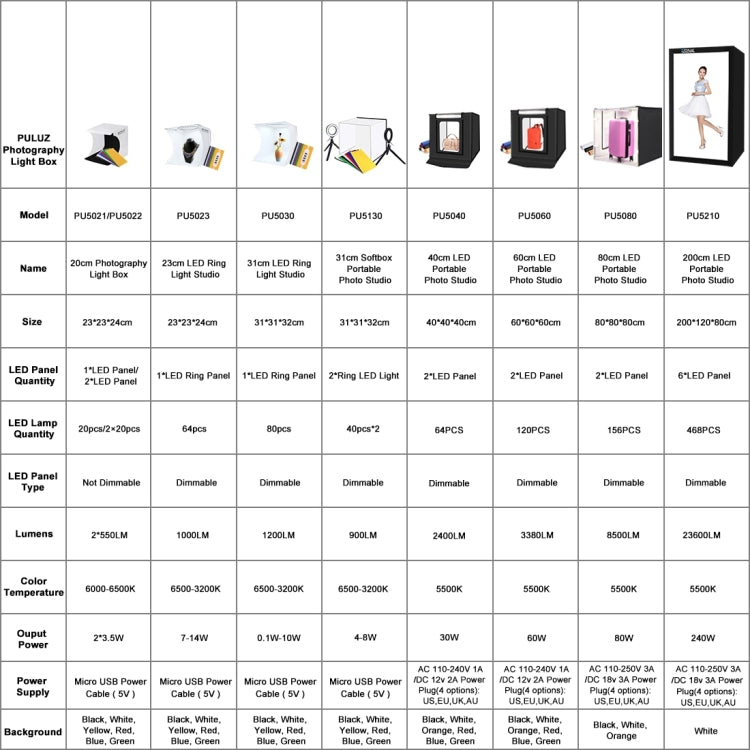 5. With 6 backgrounds pads, and build-in light and USB cable. Three colors temperature switch.